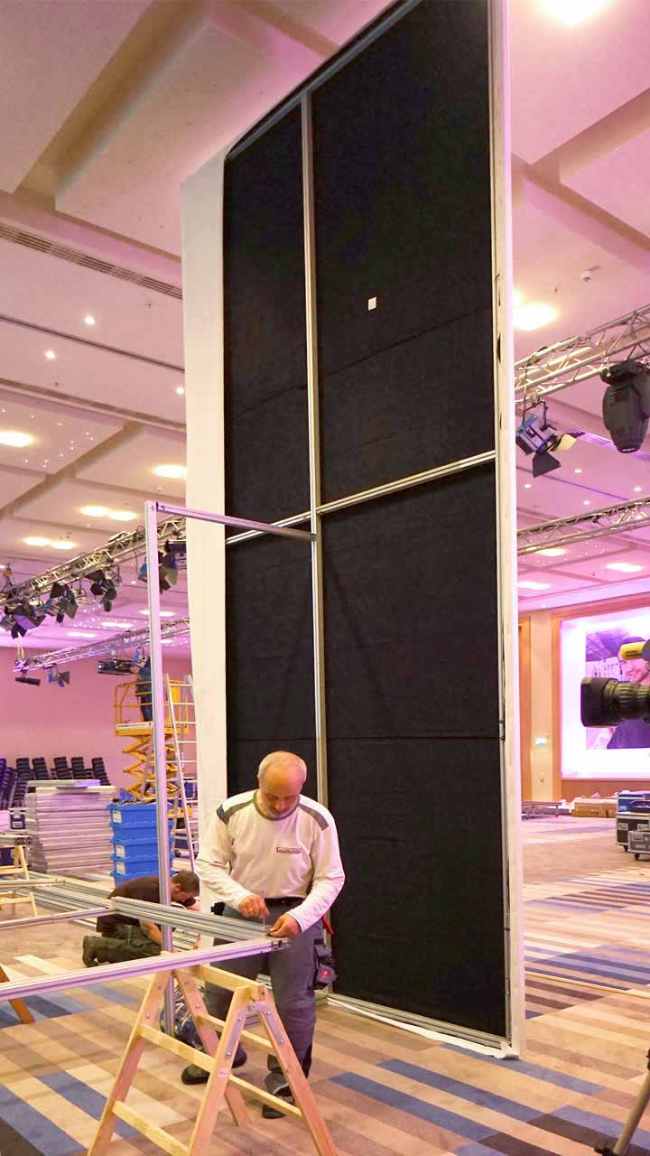 Das Bühnenwandsystem von BÜHNTEC® ist dank des eingesetzten, handelsüblichen Aluminiumsystems und der von uns entwickelten Stückelung, schnell auf- oder umgebaut.